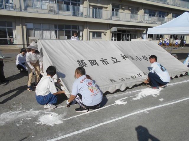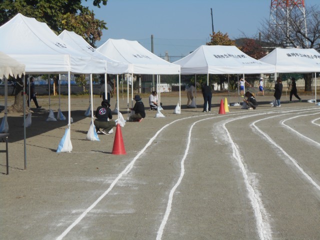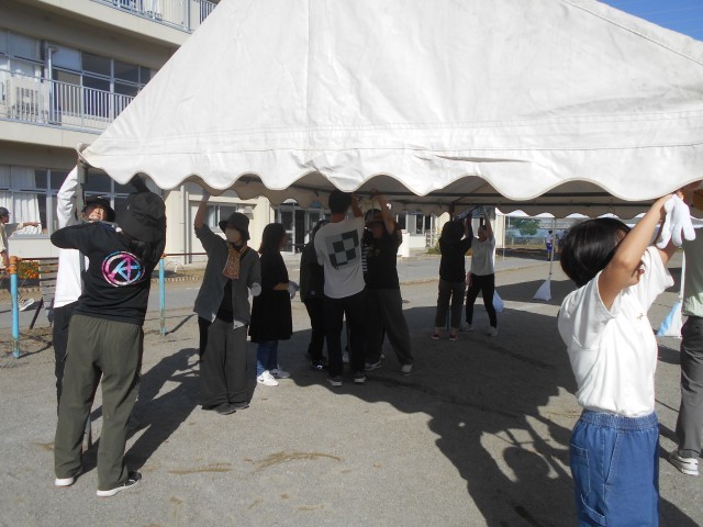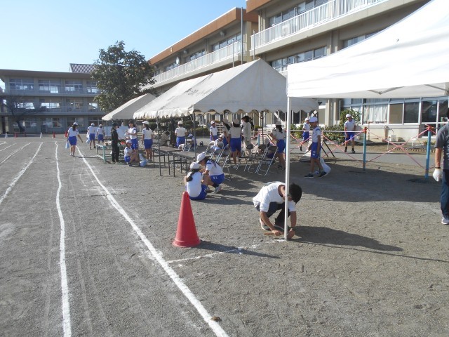 17日(金)午後は、6年生と職員、そしてPTA役員、体育委員の皆さんで運動会の準備をしました。テントは午前中に5年生が全て運んでおいてくれました。
