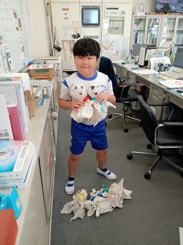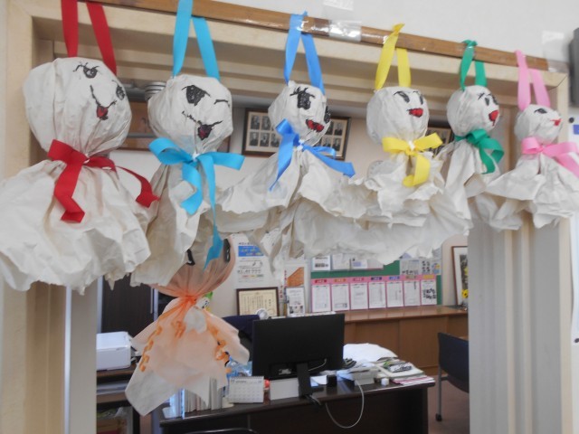 今日の4時間目に5年生が、準備の傍らで、すてきな「てるてる坊主」を作ってくれました。