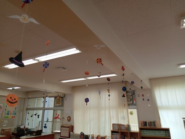 図書室には季節を彩る飾り、今はハロウィンやハーリーポッターなどの装飾が施されています。