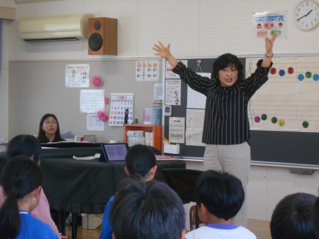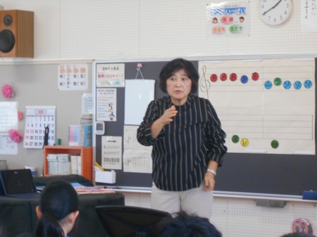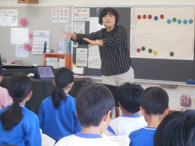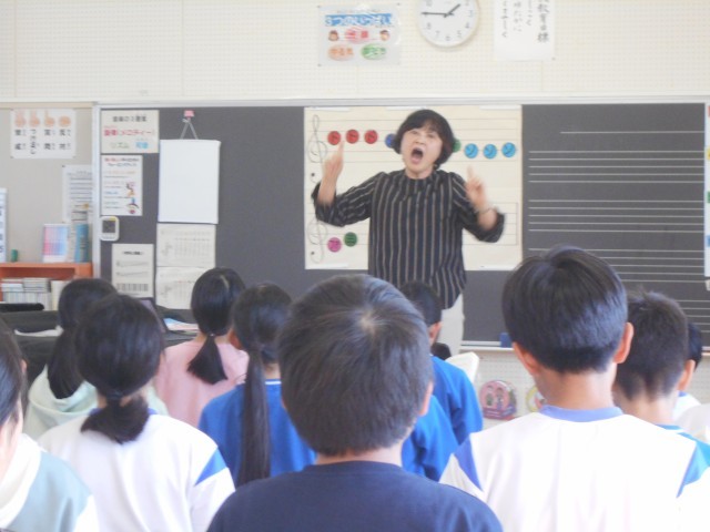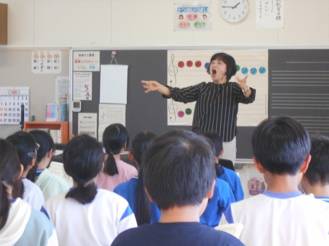 27日(月) 5時間目、5年生の音楽の時間に合唱ボランティアさんにご指導いただきました。