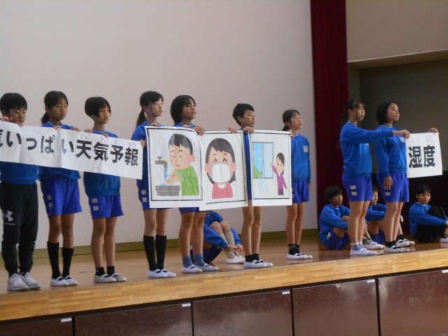 保健委員会では、これまで「熱中症予防天気予報」(ネッチュウー・チュウー・チュウー・ショウ・・・)を、毎朝放送で流したり、運動会の給水タイムの時に呼びかけ足りしてきました。でも、運動会も終わり、今度は「熱中症」よりも「感染症」の流行が心配される時期になりました。