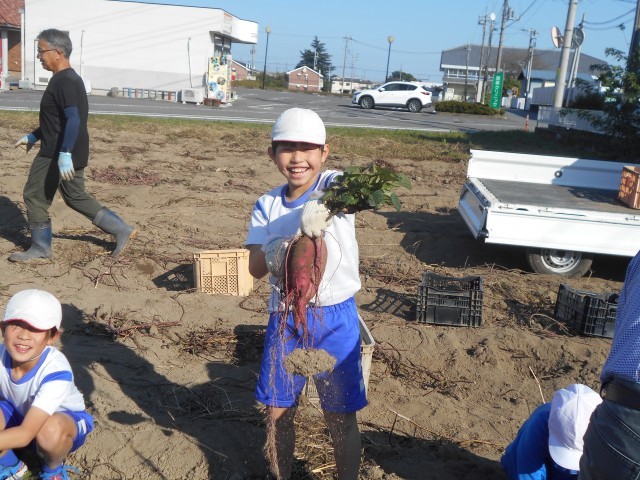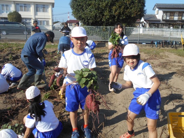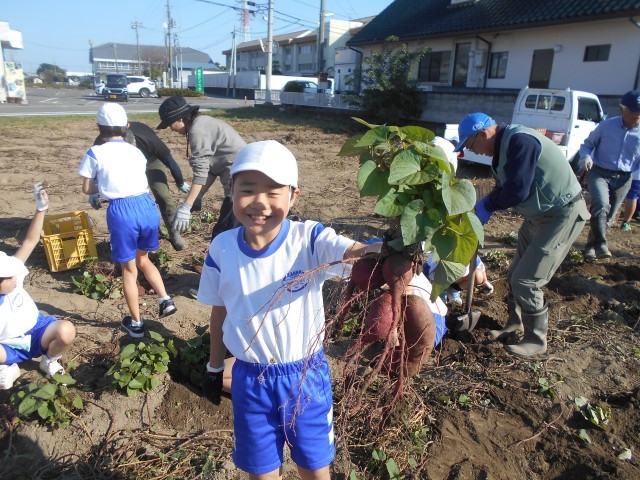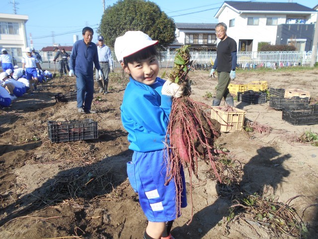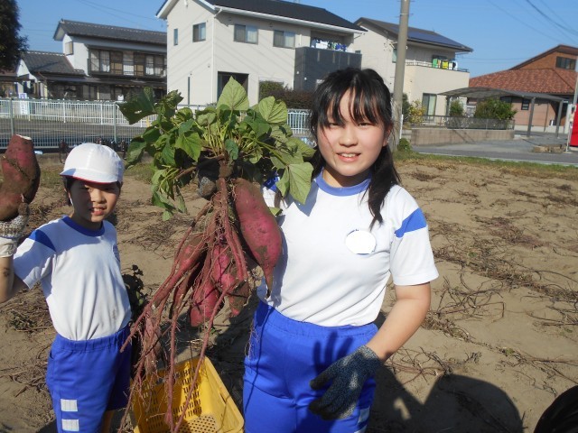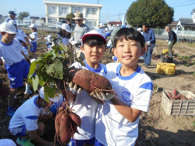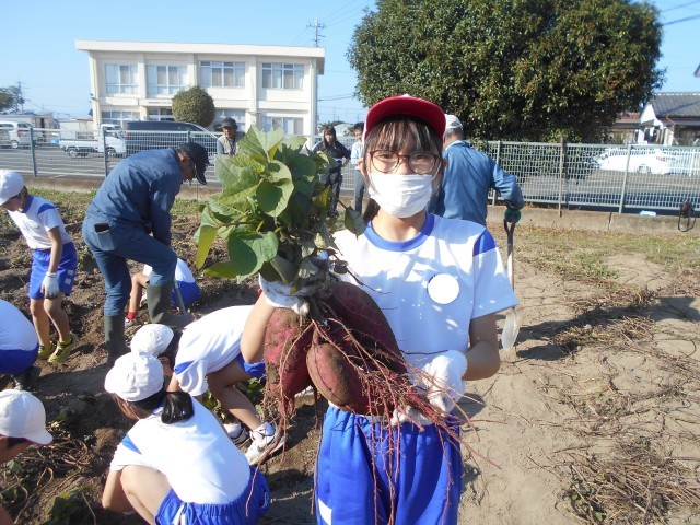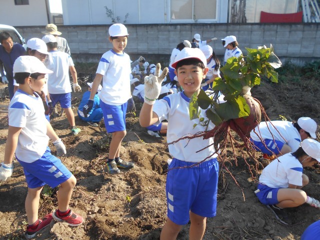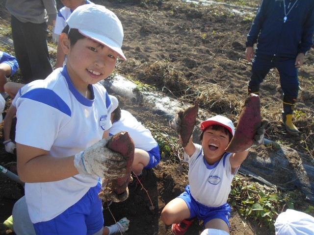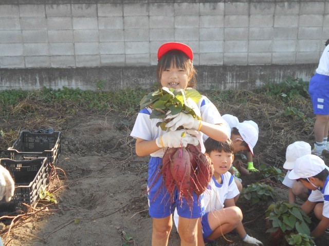 手でまわりを丁寧に貼り進めながら大きなサツマイモと格闘しています。