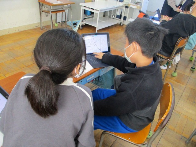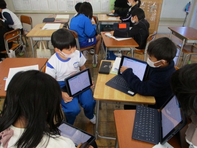 7つの三角形をどのよう分類すれば、誰が分けても同じ仲間分けができるようになるのかを、各自、グループ、全体で考えました。