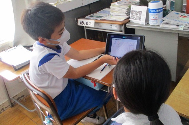 過日の2年生「国語」、5年生「学級活動」、4年生「音楽」の授業に続いて、今日は3年生の算数の授業でプレ授業を行いました。