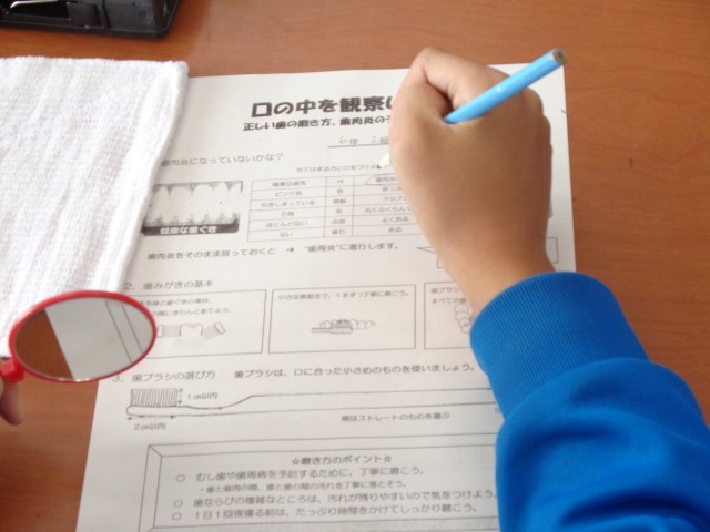 歯の大切さを学んだり、「染め出し」をして、正しい歯みがきの仕方を教わったりしました。