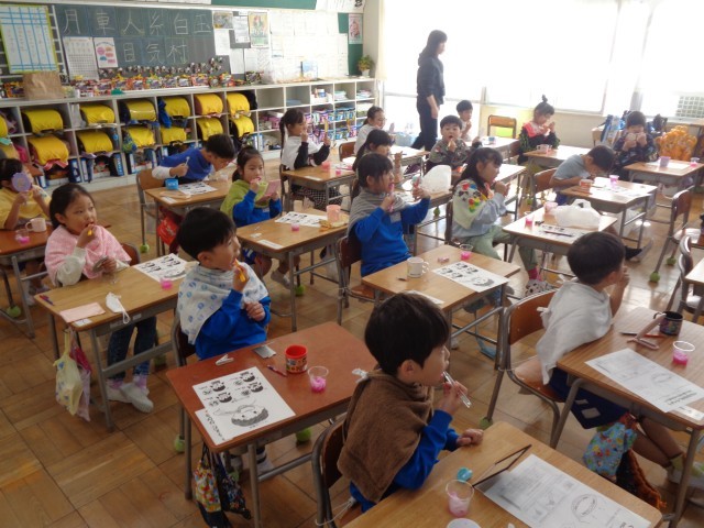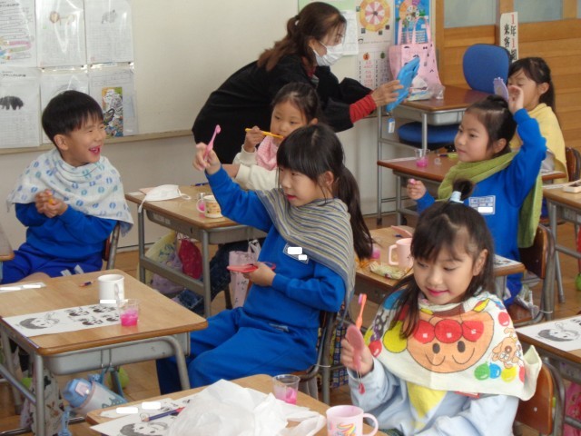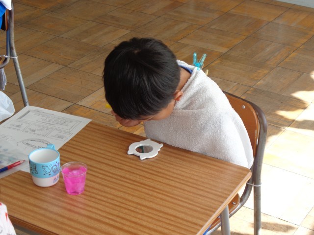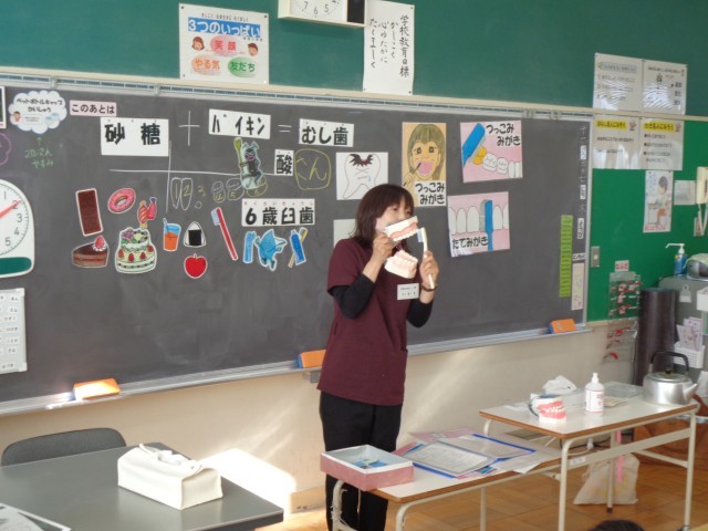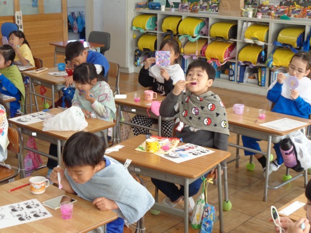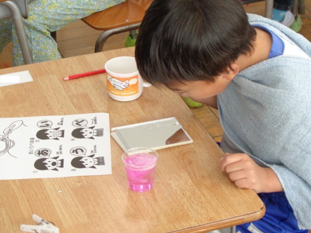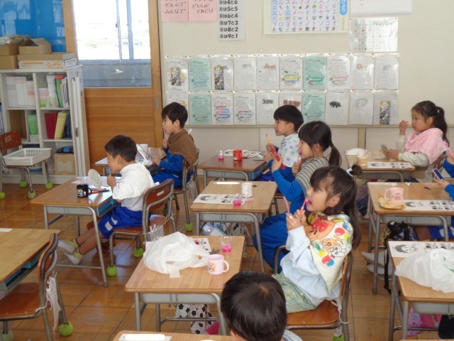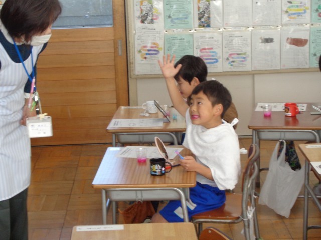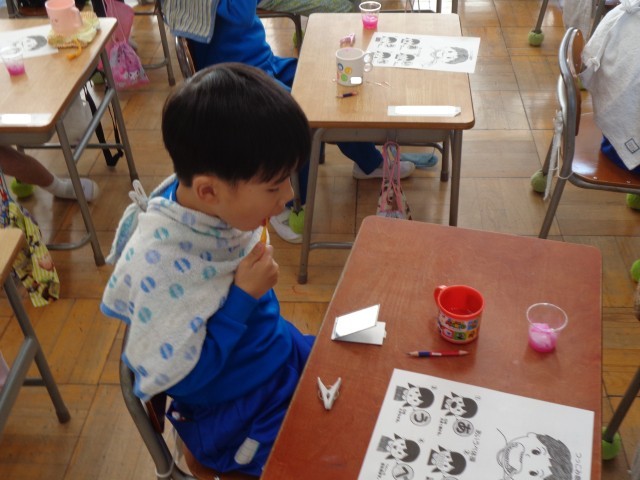 歯の大切さを学んだあと、「染め出し」をして、正しい歯みがきの仕方をていねいに教わりました。