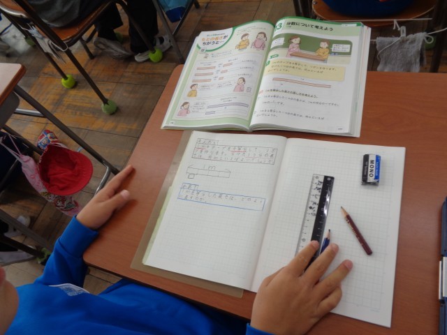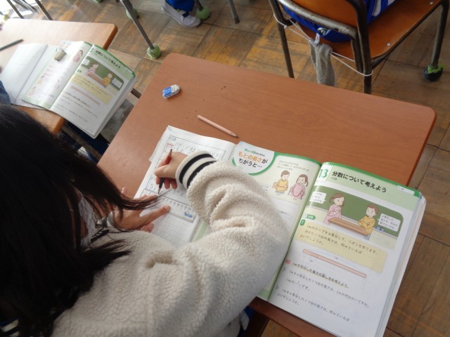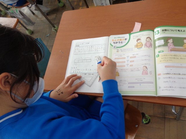 今日の問題「1mのテープを4等分したときの分けた一つ分の長さは?」