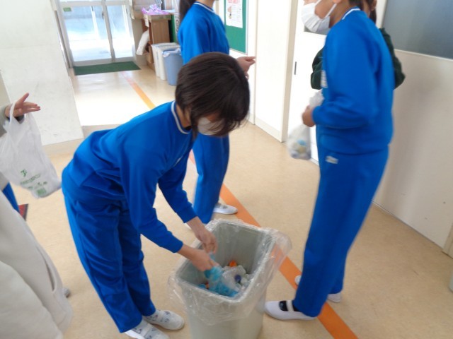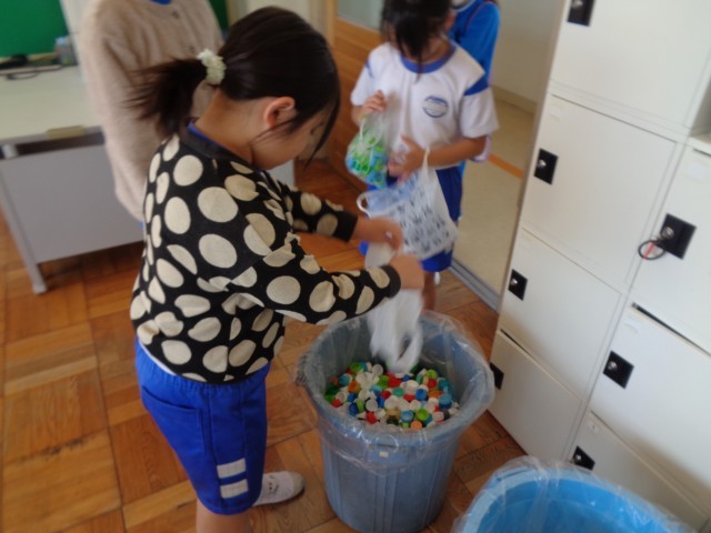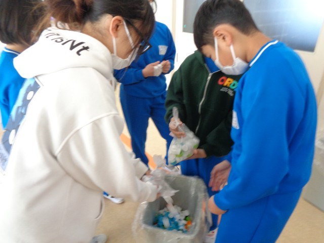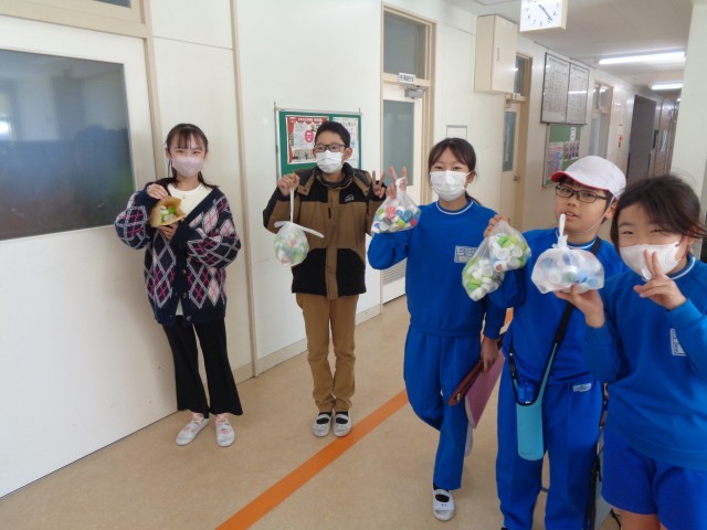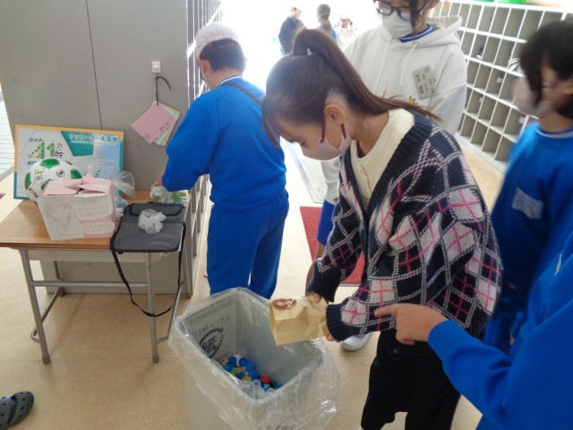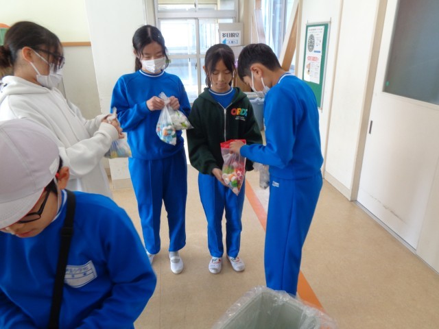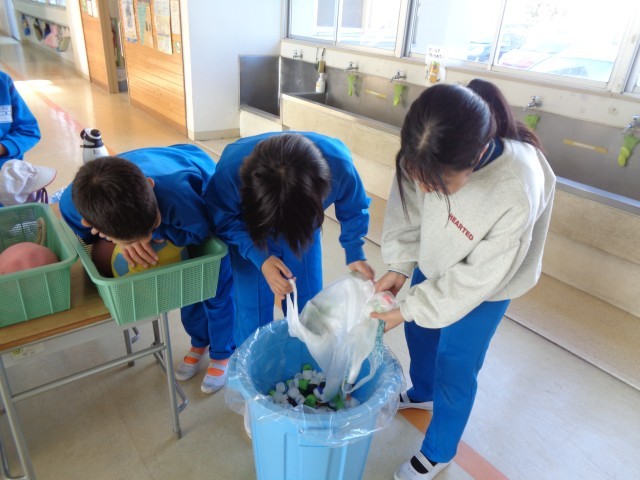 代表委員会では、2学期から「ペットボトルキャップ回収活動」を毎月行って来ました。2学期の回収最終日となる今日の20分休みに、東西両児童玄関で回収活動を行いました。
