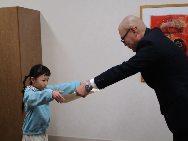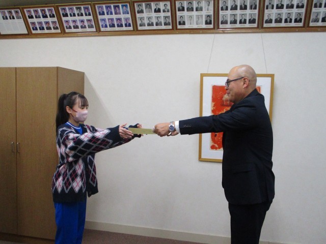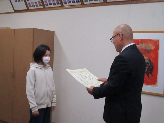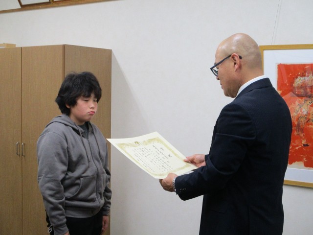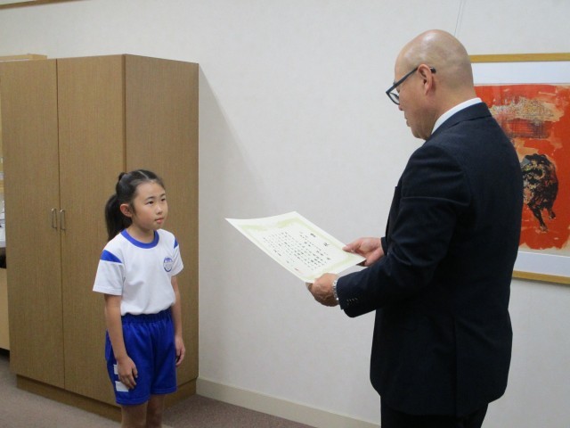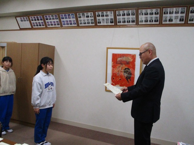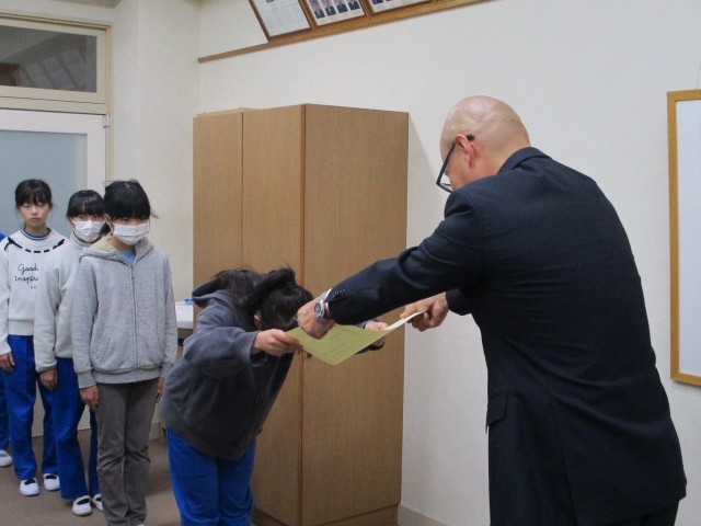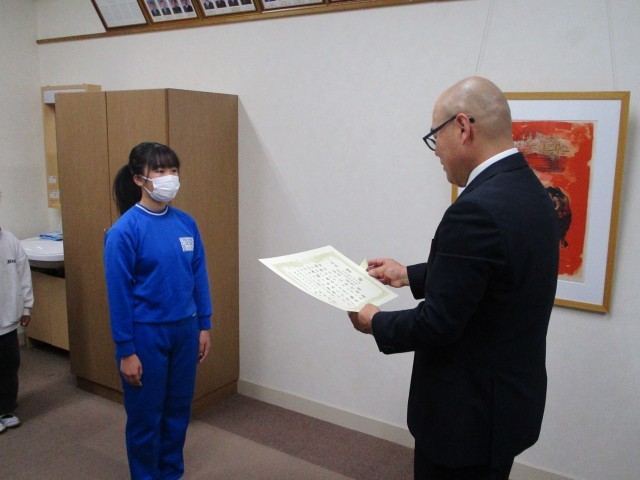 社会体育や各種団体主催の大会の表彰も、20分休みに校長室で行いました。
