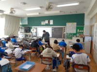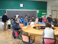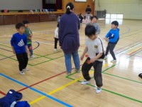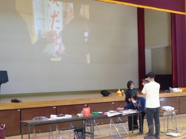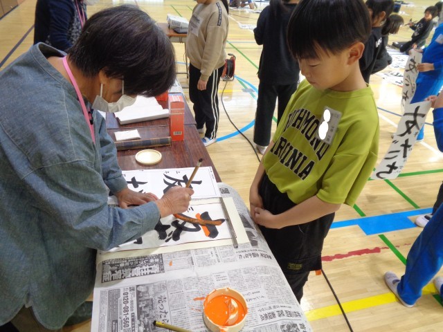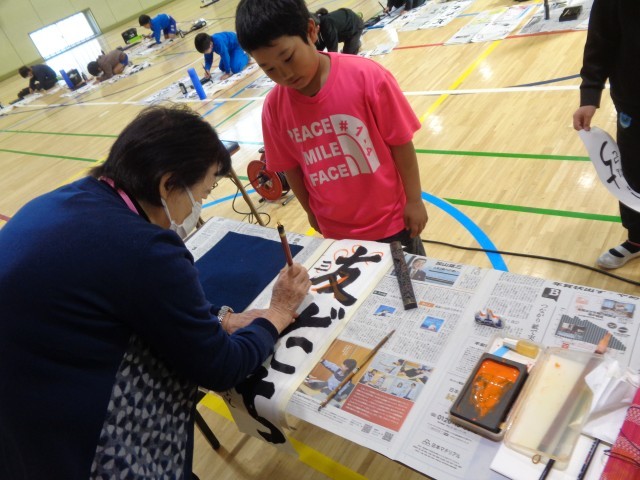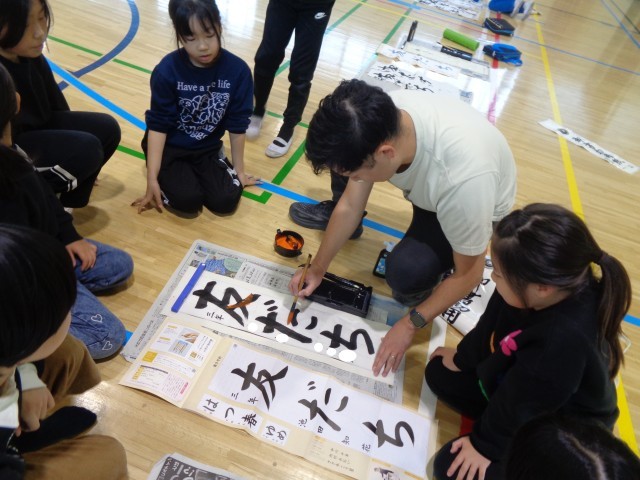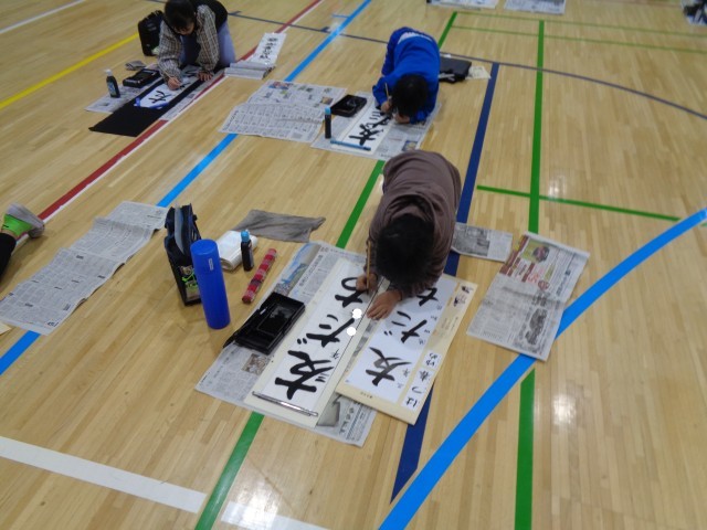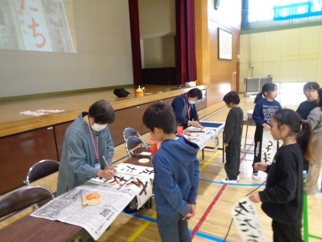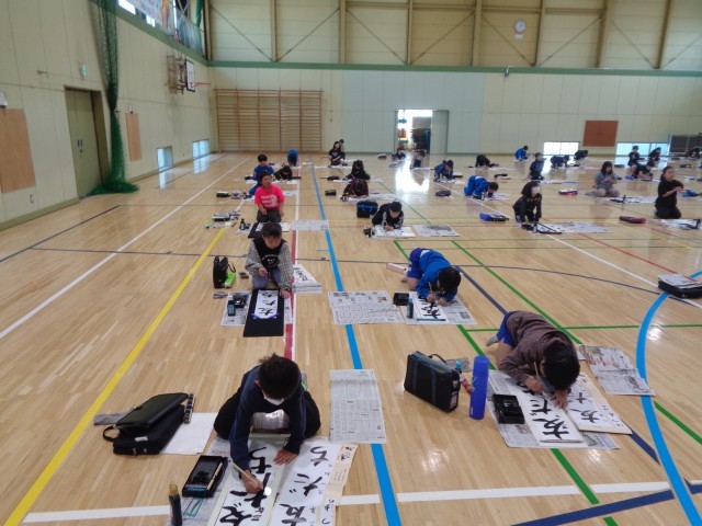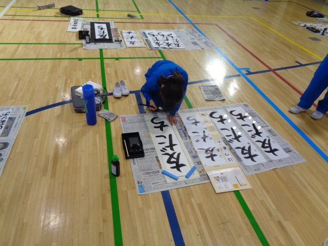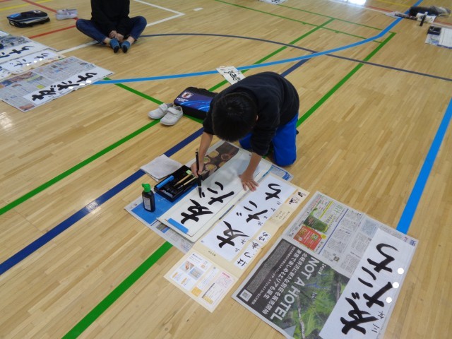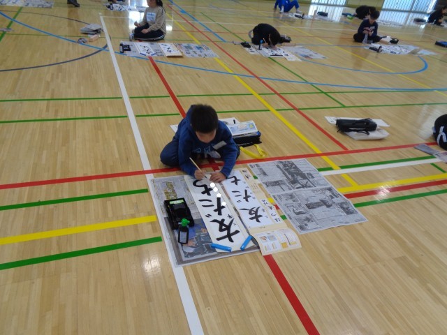 普段の習字とは違って、学年児童全員が体育館に集まり、床に置いかれた条幅紙(じょうふくし)に書き初めを行います。 なかなかバランスを取るのも難しいです。児童は真剣に練習に取り組んでいました。