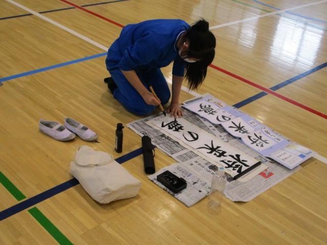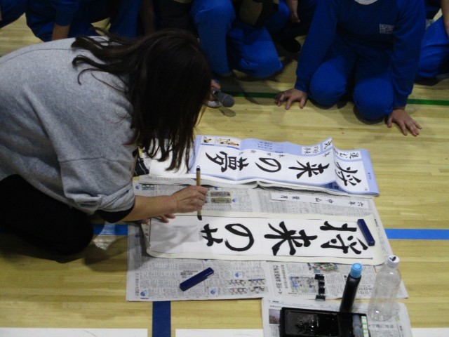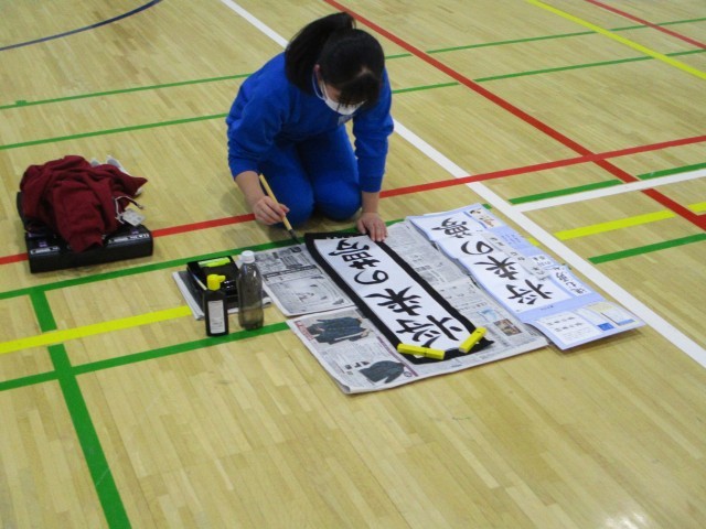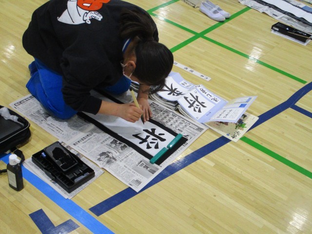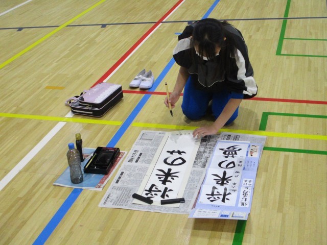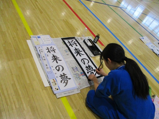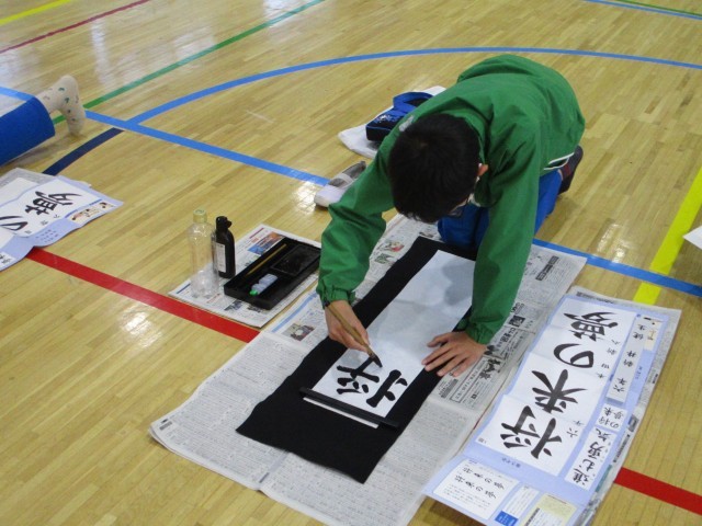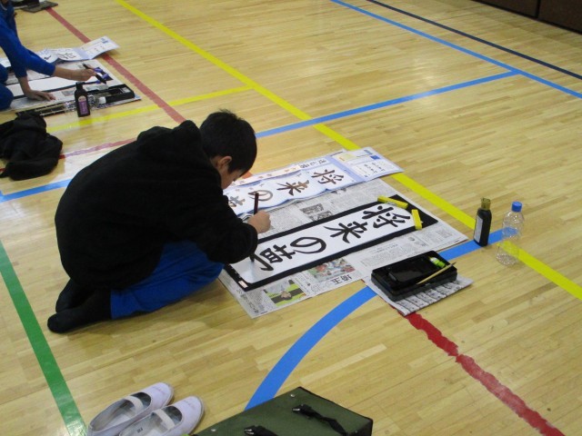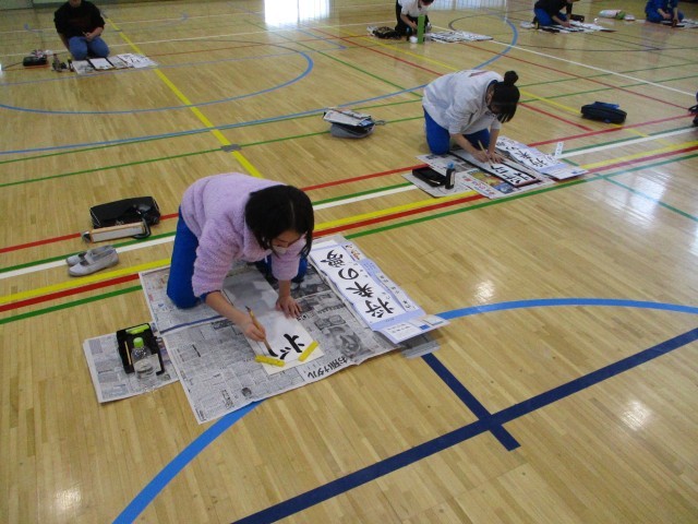 19日(金)午後、6年生は体育館で書き初めの練習をしました。
