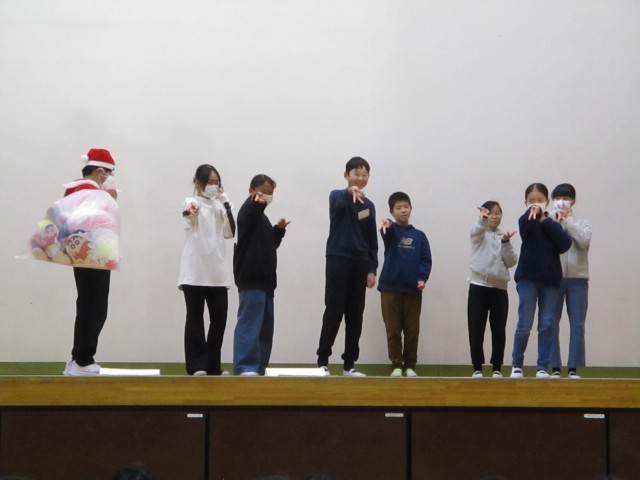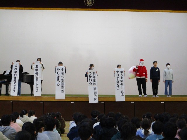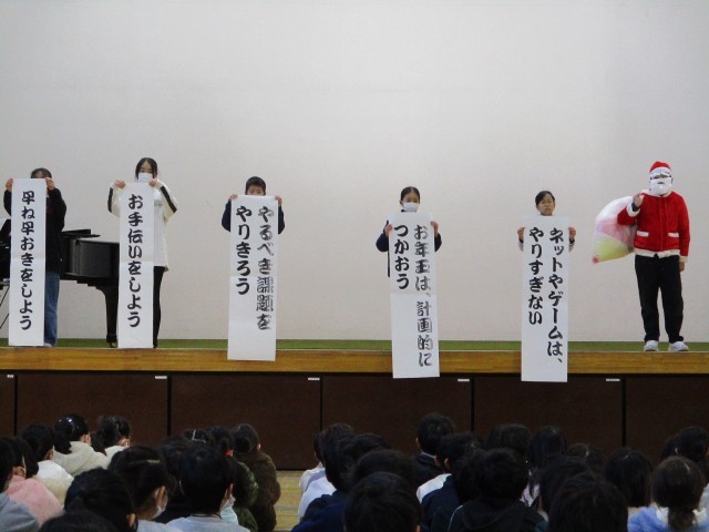 終業式に先立って、代表委員から「冬休みの過ごし方」について、劇を交えて5つのポイントとして全校児童に伝えてくれました。