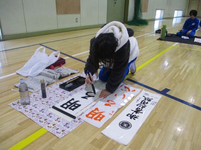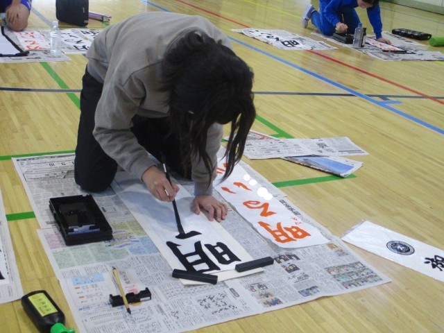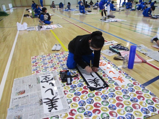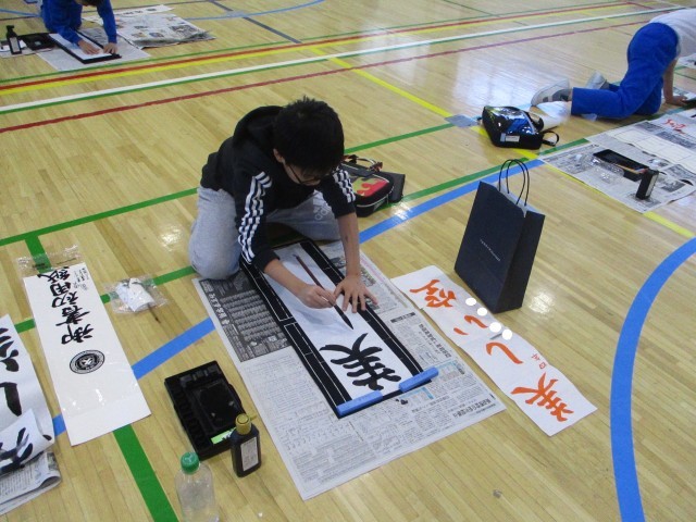 9日(金)3・4時間目、4年生が体育館で「書き初め大会」を行いました。
