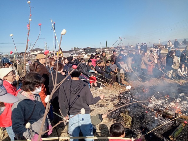燃えきったあとは、繭玉を焼いてたべました。天候に恵まれ、多くの人が集い、賑やかに行なわれました。