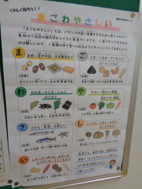 「毎月19日は食育の日。 給食には「ま・ご・わ・や・さ・し・い」の全ての食材が入った和食献立を取り入れるようになって3年ほど経ちました。皆さんは、「まごわやさしい」の7種類の食材を言うことができますか?「まめ・ごま・わかめ・やさい・さかな・しいたけ・いも」のことです。今日の給食にも入っています。さがしてみえくdさいね。」