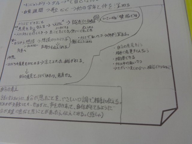 その後、一貫校毎に分かれての班別協議では、自分の考えを発表しあい、意見交流を行いました。