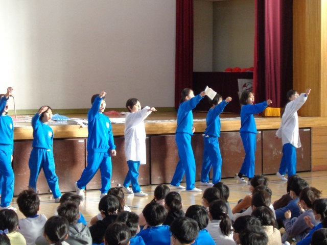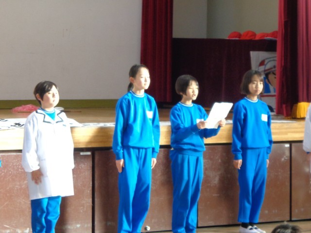 (写真は、学校保健委員会で「感染症予防天気予報」をする保健委員のみなさん)