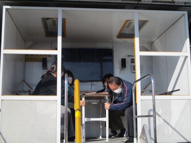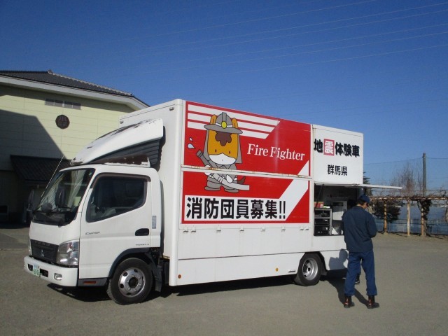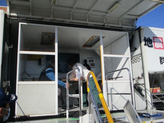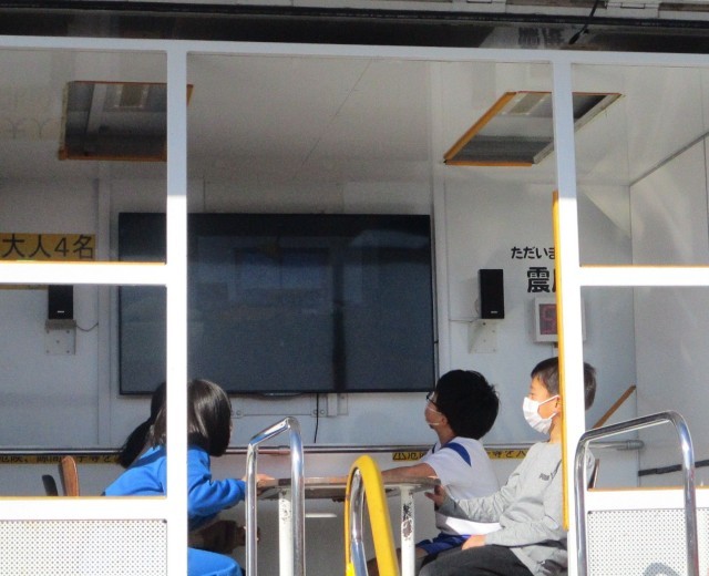 最初に、多野藤岡広域消防本部の方から説明をしていただき、4人ずつ起震車に乗りました。椅子に座り、固定された机を掴みながら震度5の揺れを体験させてもらいましたが、大きな揺れに驚いている児童もいたようでした。