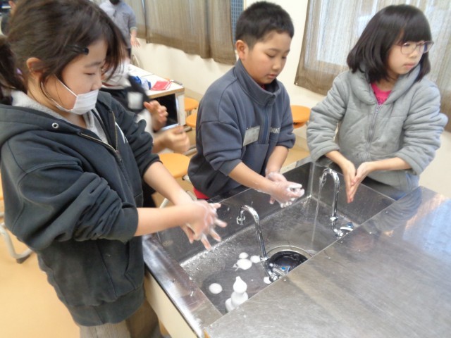 4日(水)5・6時間目、3年生は家庭科室で手洗い教室会を開催しました。