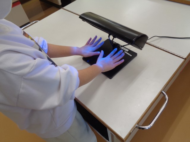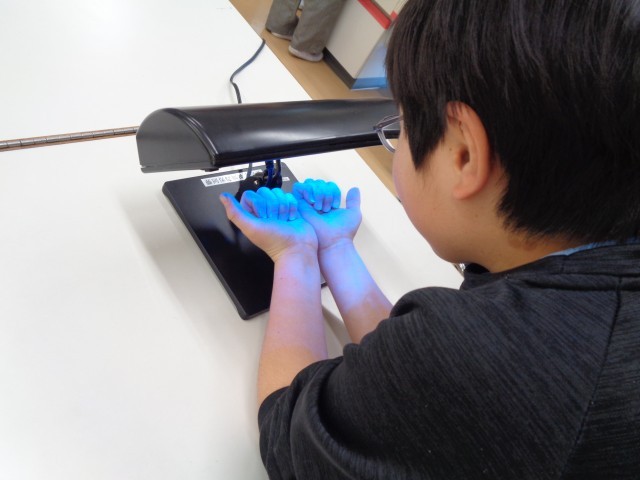 まだ光っているところは洗い残し。指先や手首などに洗い残しがある子も多かったようです。「しっかり洗ったのにな~」「まだ汚かった」という声も聞こえてきました。
