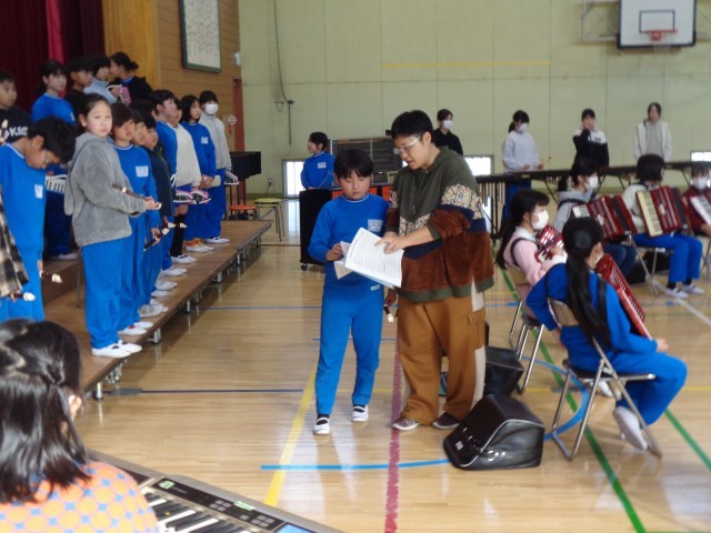 13日(金)6時間目、5年生の合奏練習には、中学校の音楽担当の先生を特別講師としてお招きし、ご指導をしていただきました。