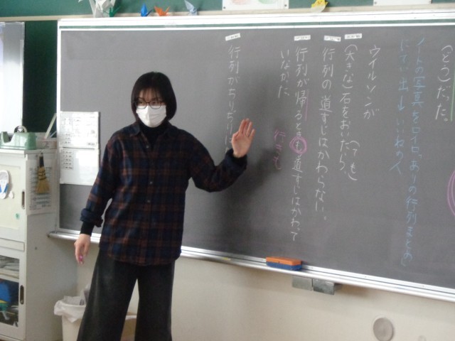 「ありの行列」これまでの学習を思い出しながら、今日は4段落の文章を短くまとめる学習をしました。
