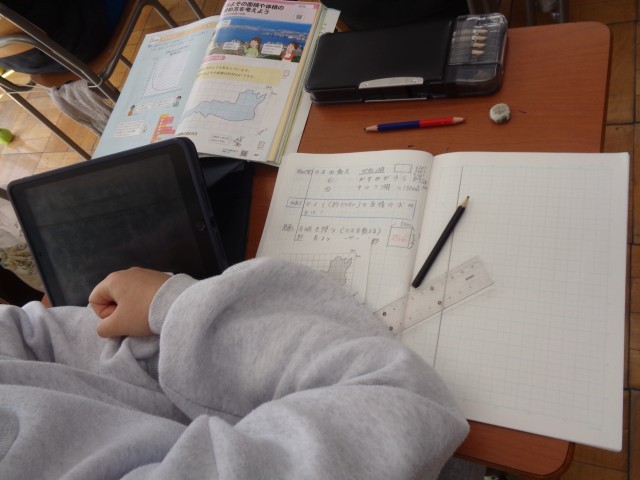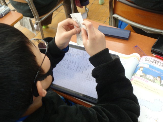 与えられた歪んだ水たまりのような形、果たしてどのように面積を求めたらいいのでしょうか?これまでにない、課題に対して、6年生は一生懸命考えました。