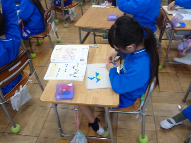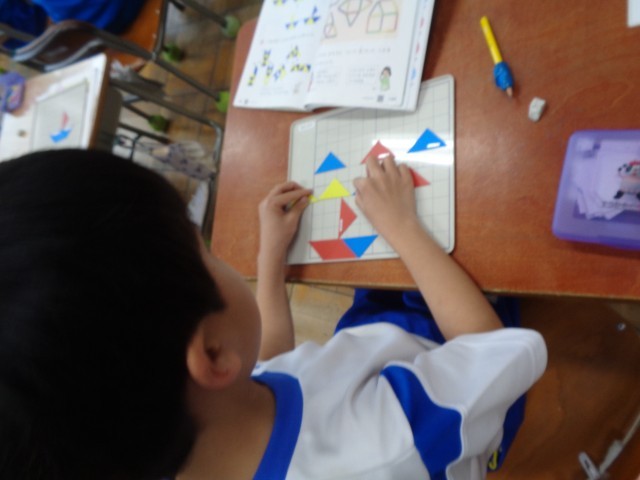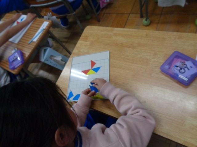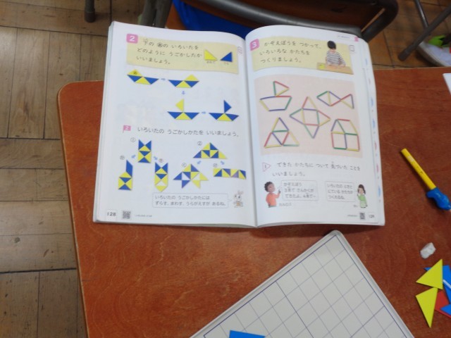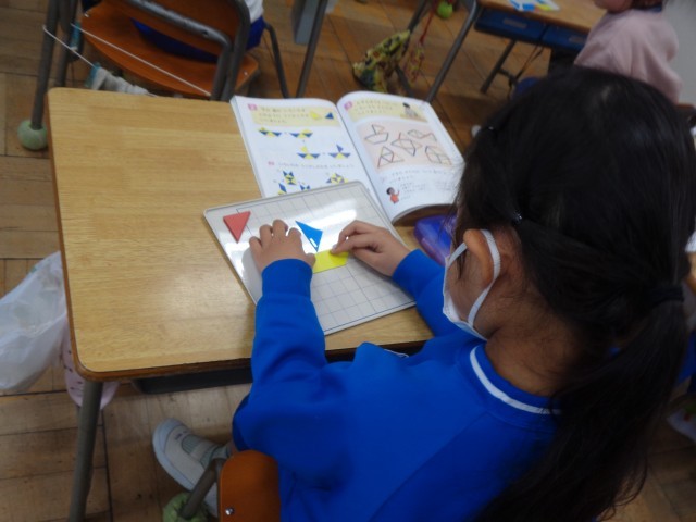 色板で教科書にある図と同じかたちを作る問題にもチャレンジしていました。