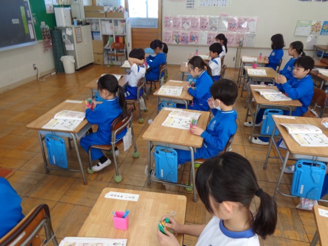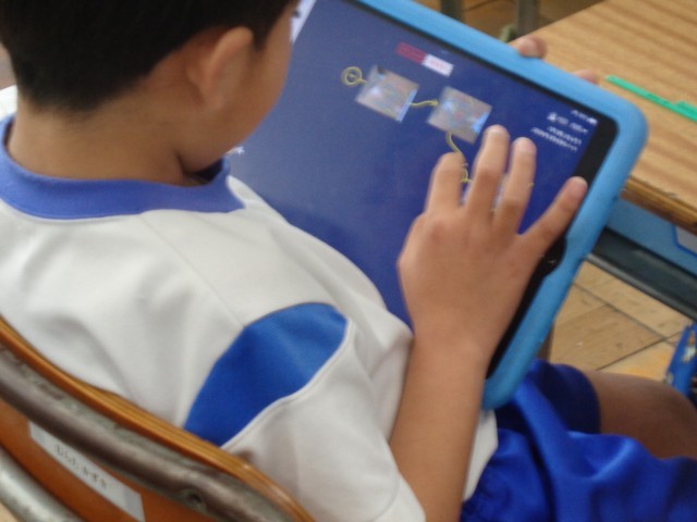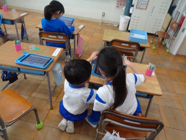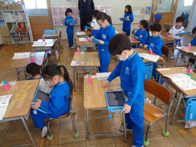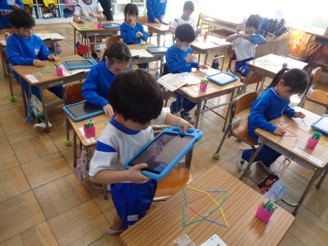 1組の子どもたちも、夢中になって形作りに取り組みました。そして、画像を取り込み画面を共有し、さらに友だちの形を参考に自分でも作ってみました。1年生もICT端末を自在に操っていました。ICT使いこなす姿に大きな成長の姿を感じました。