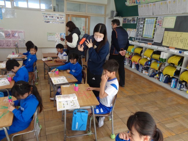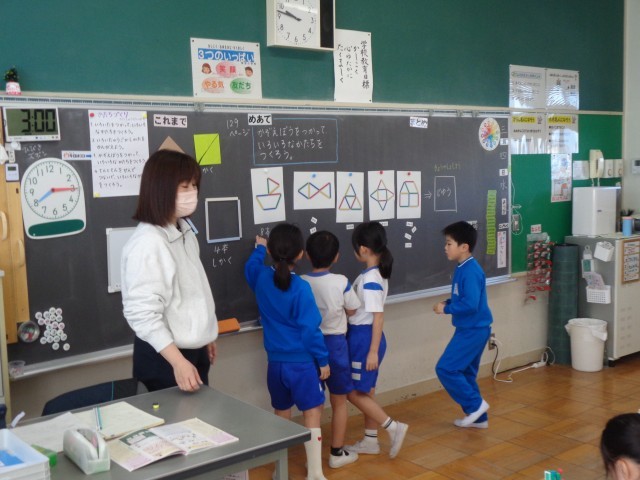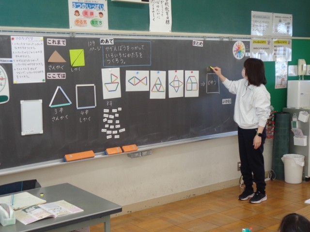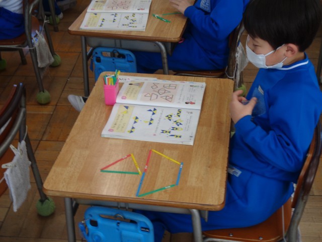 今日は、先日2組に続いて、校内研修の研究授業として公開して、校内の先生方が授業を参観しました。前回の授業では三角形の色板を使って自分の好きな形をいろいろ作りましたが、今回の学習では、それをもとに、棒を使っていろいろな形づくりにチャレンジしました。今回も作った形は、ロイロノートに保存しました。