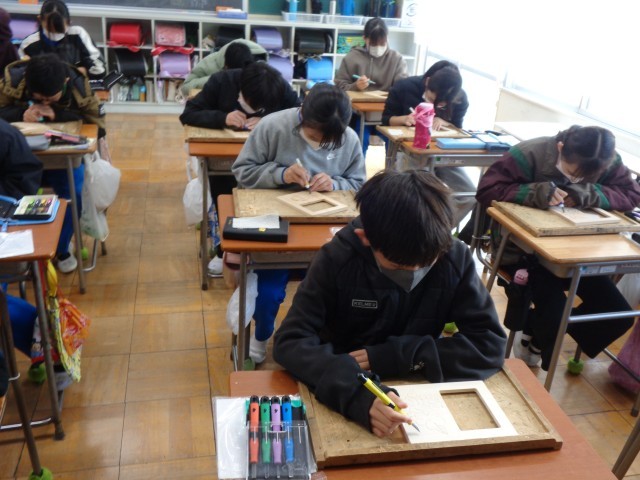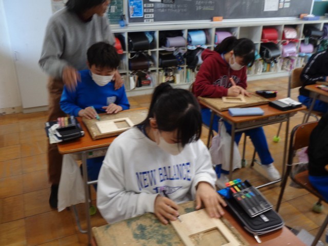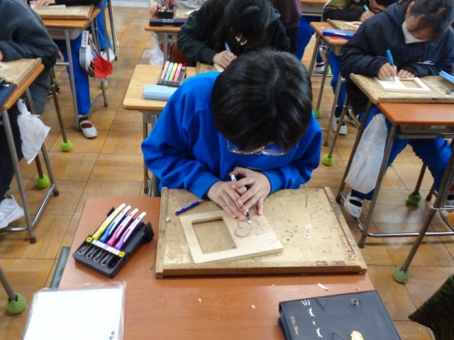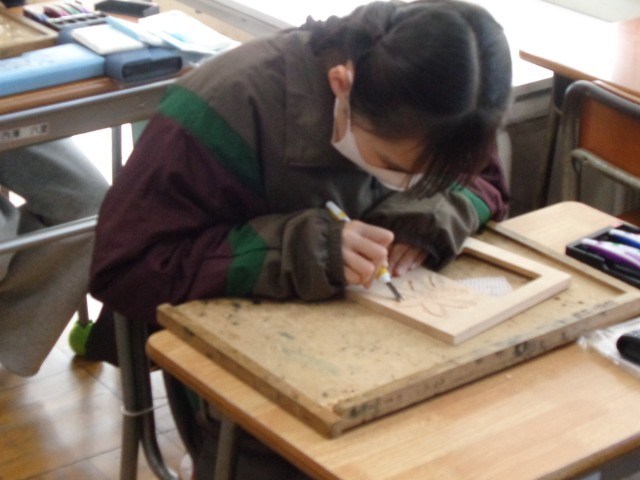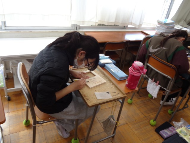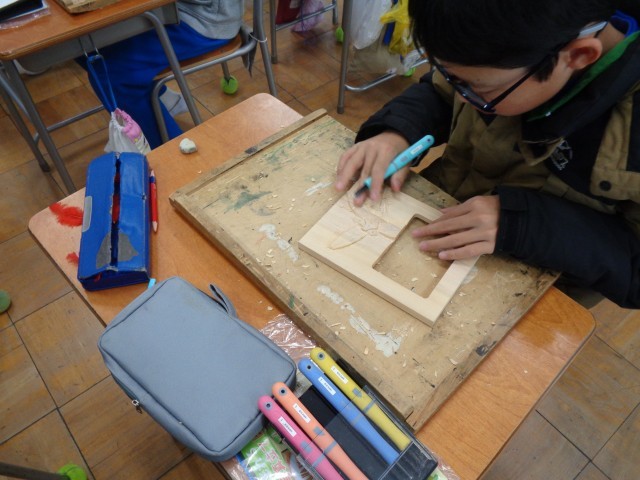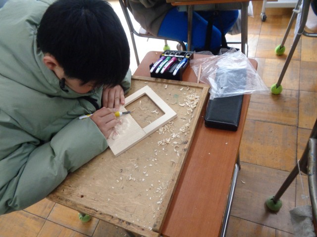 安全に気を付けながら、彫刻刀を駆使して真剣に制作に取り組んでいます。