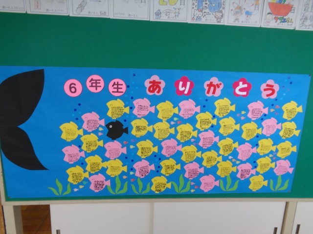 6年生の廊下には、在校生が心を込めて作った6年生へのメッセージ(寄せ書き)が、きれいに掲示されています。