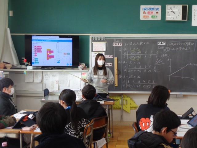 どの数値を変えるとグラフがどのように変化するのか、比例の関係をこのプログラミングを使いながら、グラフに表して考えました。