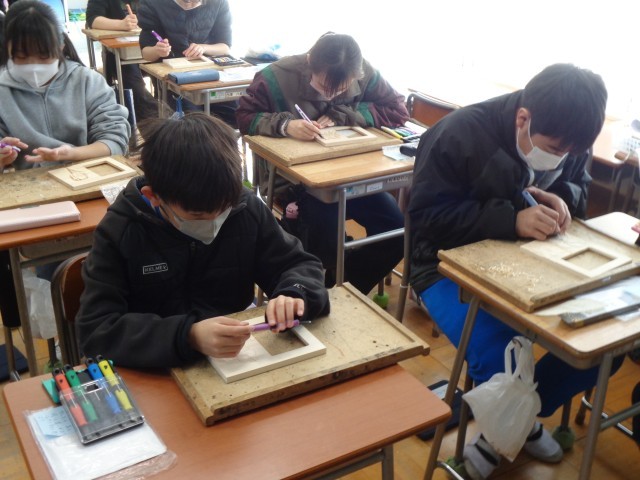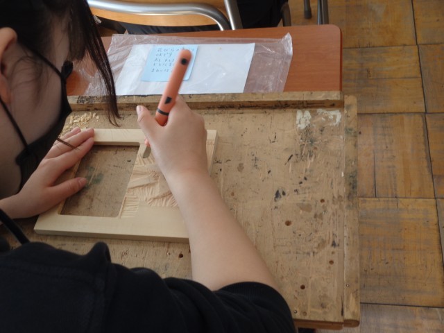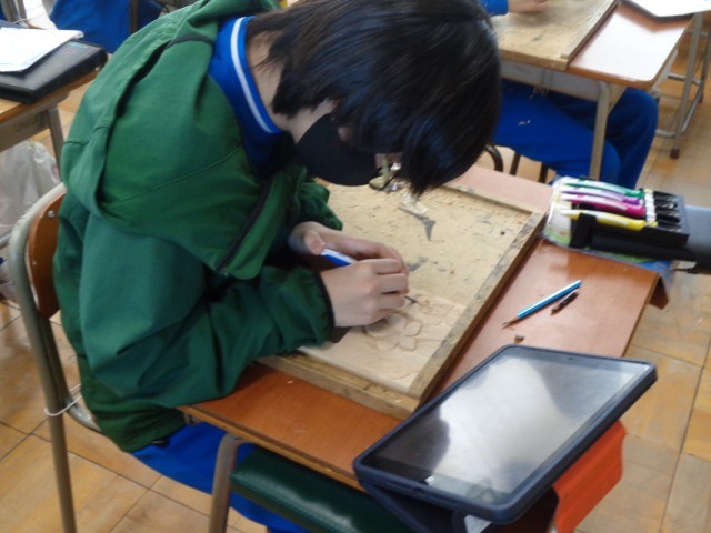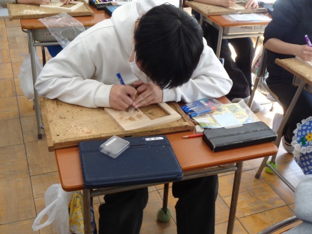 今日も、安全に気を付けながら、彫刻刀を駆使して真剣に制作中。