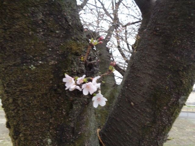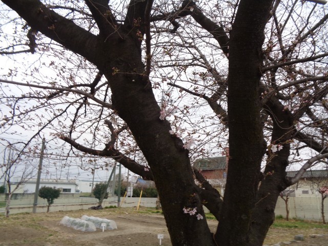 今朝、校庭東側に行ってみると、神流小の畑のところにある桜が開花していました。