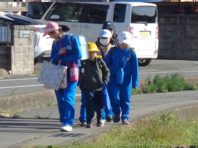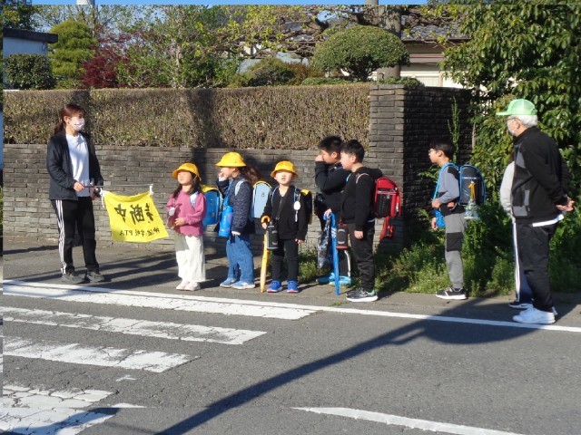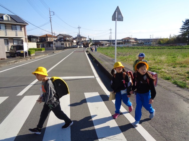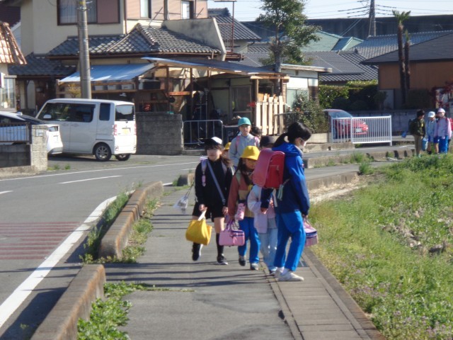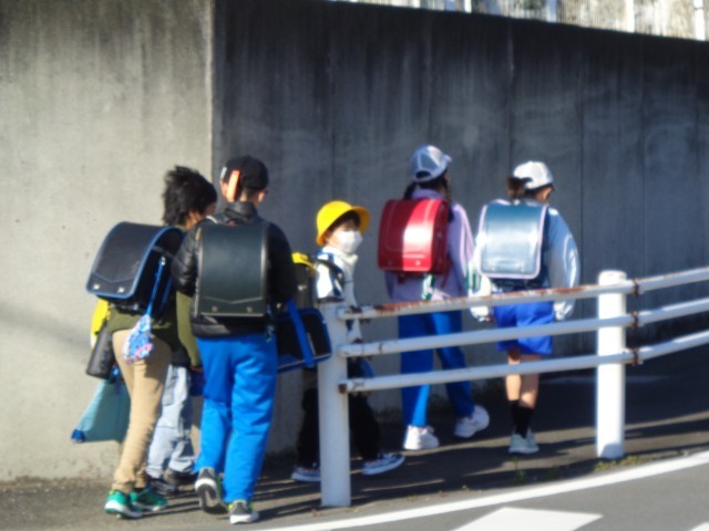 8日(水)快晴のもと、1年生も登校班で元気に登校してきました。