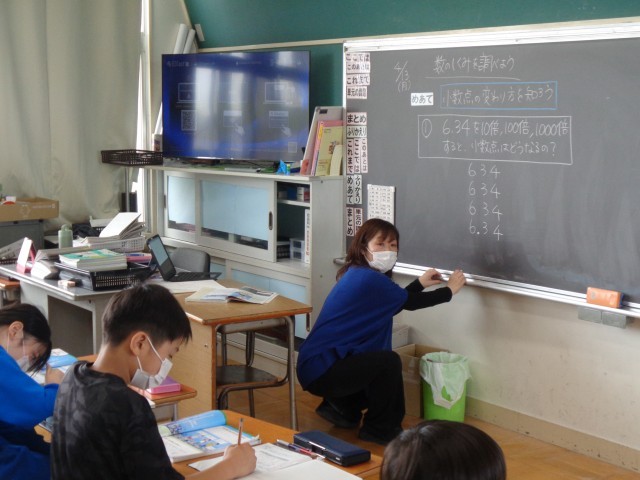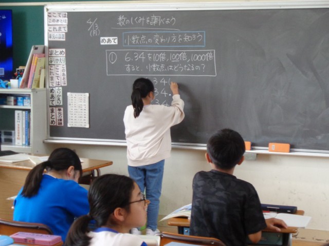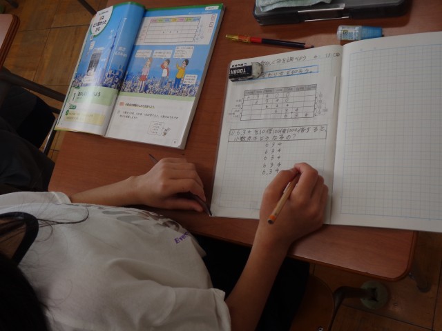 数のしくみをしらべて、小数点の位置の変わり方を確かめていました。