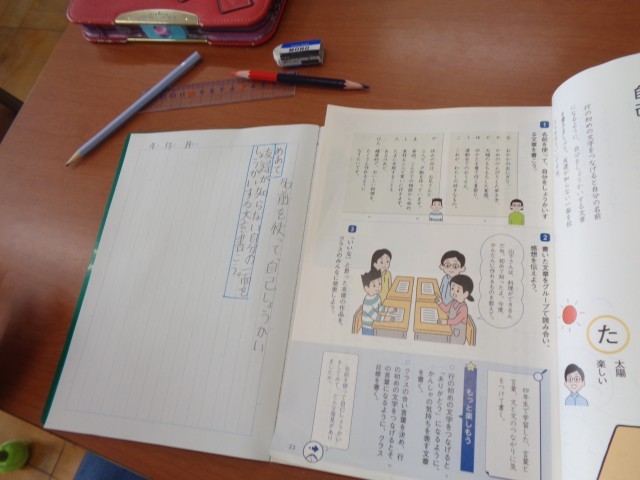 教科書の例にしたがって、自分の名前を一文字ずつノートの上に書き出して、それに合うように好きなものをならべて、自己紹介する文を作りました。
