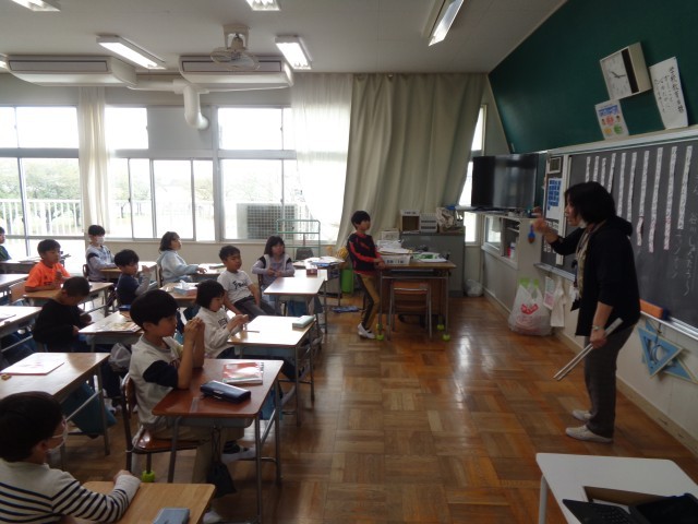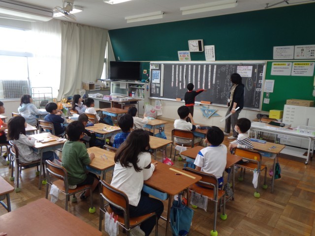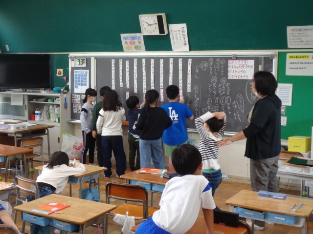 教科書は見ないで、一文ずつバラバラに並べられた文とオノマトペを自分なりの考えで並べかえていました。最後に、クラス全体で考えた後に、教科書を読んで答え合わせです。