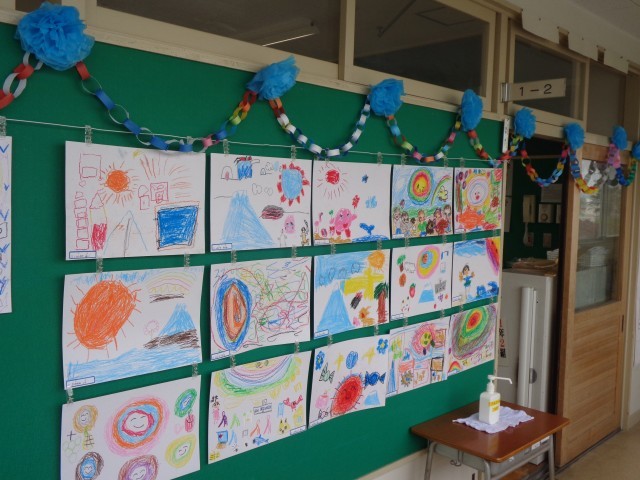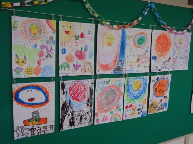 廊下に出てみたら、図工の時間にかいた思い思いの「太陽」(題名があるはずですが・・・?)飾られていました。