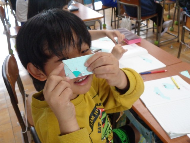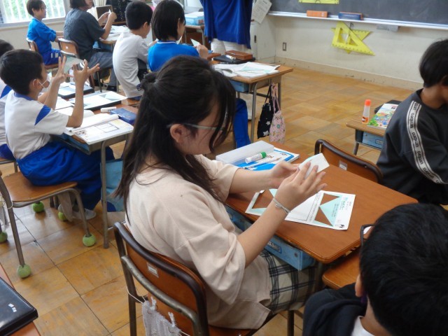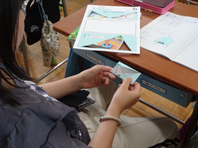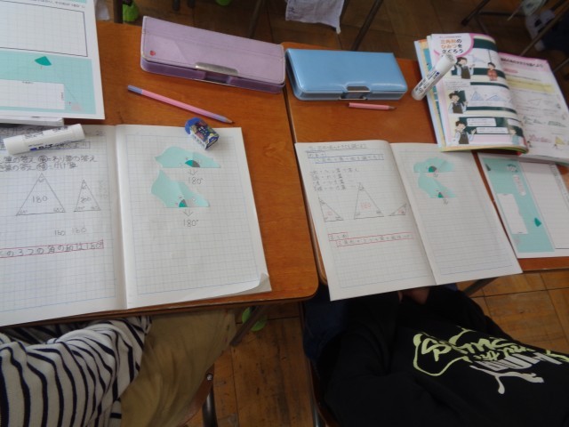 実際に、三角形の3つの角を切って、合わせてみたり、折って重ねてみたりしながら、どうなるか確かめていました。