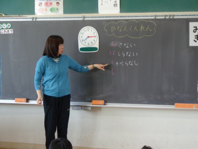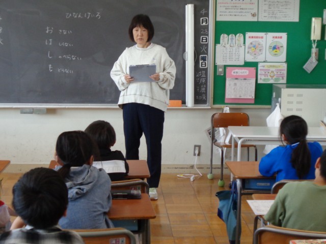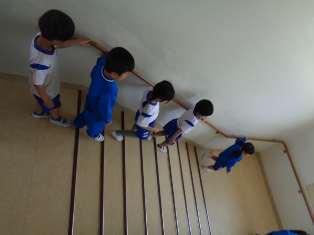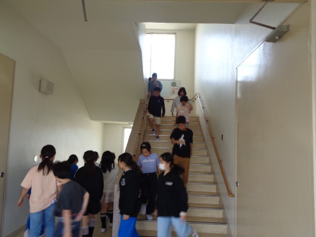 今日も、教室では担任の先生から、避難するときの注意や約束について、丁寧にお話があった後、実際に廊下から階段を通って、玄関の出口まで歩いて避難してみました。