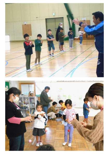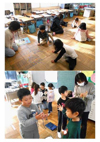 羽根つき、竹とんぼ、けん玉、こま回し、おはじき、あやとりを楽しみました。ボランティアの皆さんから、いろいろな遊び方を教えていただきました。