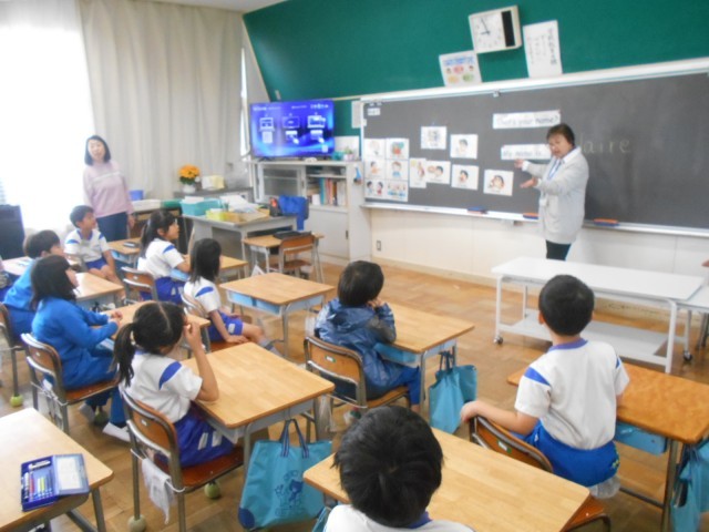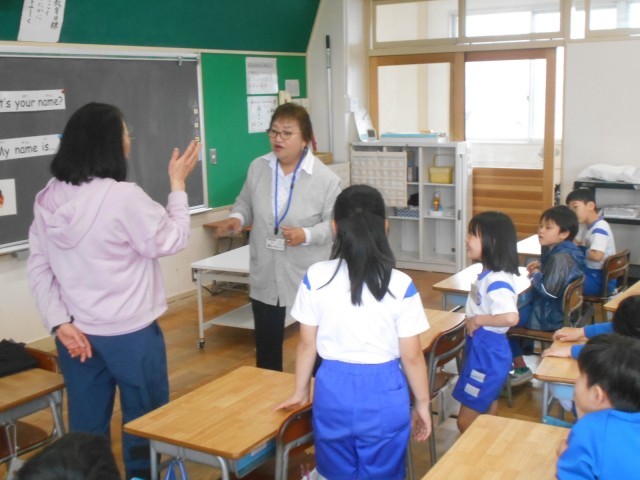 今年度から新たに教えていただくことになったALTと担任の先生と一緒に外国語を教えていただきました。今日は、まず自己紹介のしかたからスタートです。