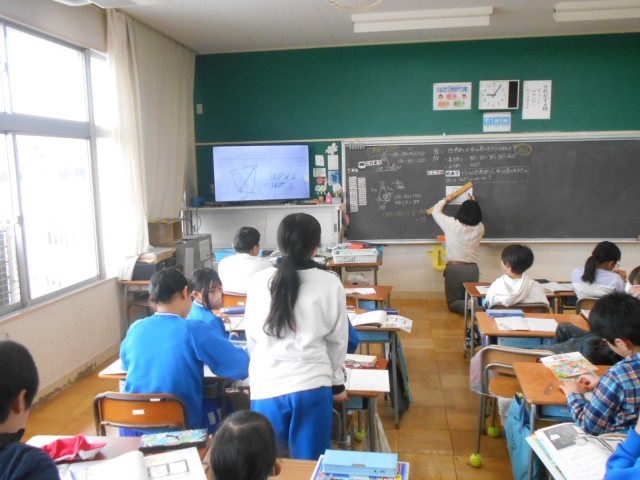 今日のめあては「どんな四角形も4つの角の大きさの和は360度なのかな?」が」