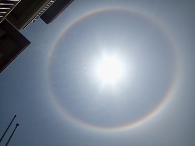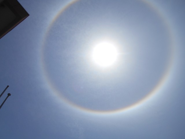 とても珍しい光景でした。調べてみると、これは、「暈(かさ)」とか「ハロ」「ハロ現象」とか、言われているそうです。太陽に薄い雲がかかり、氷の粒に光が反射して、太陽の周囲に光の輪が現れる現象だそです。太陽の周りに現れたものは日暈(ひがさ)などとも言われるようです。低気圧や前線が接近している証拠で、雨が降る確率が高いそうです。