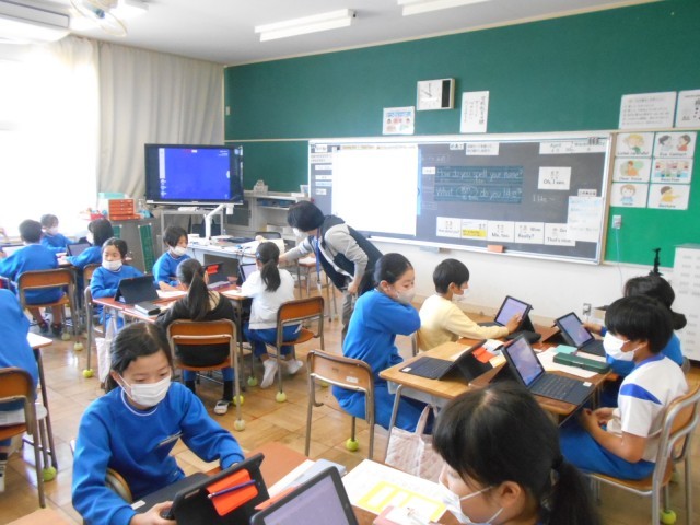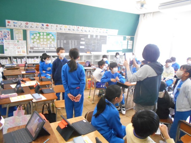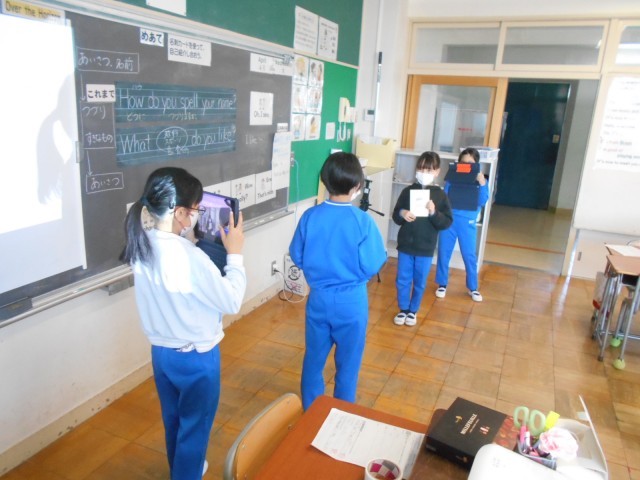 今日は、あいさつ、自分の名前のつづり、自分の好きなものを伝え合うコミュニケーションの様子を、グループになってお互いを動画で撮影しました