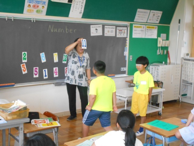 ALTの先生が示すカードを見て、早く英語で答えられた人がカードを取ります。