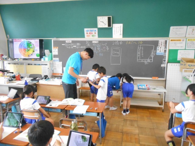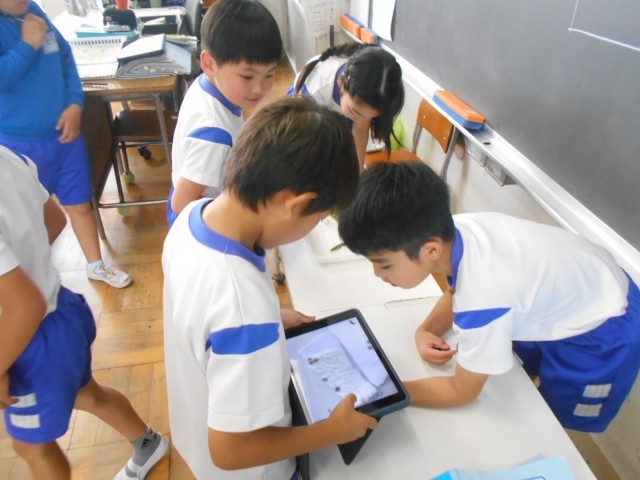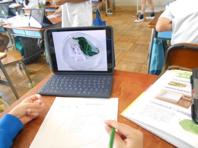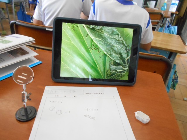 今日は、実際に虫眼鏡やタブレットのカメラ機能を使って目で見て観察し記録しました。