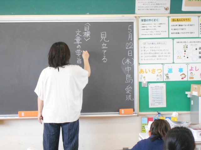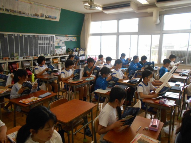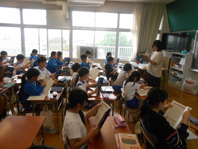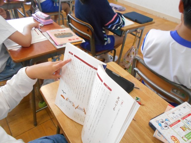 まずは、みんなで読んでみました。全員、姿勢よく本を持って音読していました。